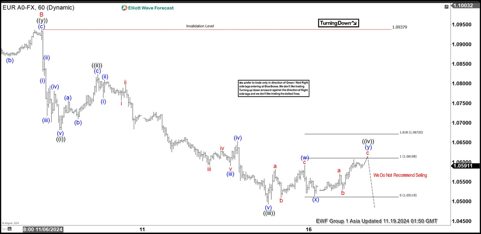 Short Term Elliott Wave View in EURUSD suggests cycle from 9.25.2024 high is in progress as a zigzag. Down from 9.25.2024 high, wave A ended at 1.076 and wave B rally ended at 1.09369. Wave C lower is in progress as a 5 waves impulse Elliott Wave structure. Down from 11.6.2024 high, wave (i) ended at 1.082 and wave (ii) rally ended at 1.0857. Wave (iii) lower ended at 1.0718 and wave (iv) ended at 1.078. Wave (v) lower ended at 1.0682 which completed wave ((i)) in higher degree. Rally in wave ((ii)) ended at 1.0825 with internal subdivision as a zigzag.