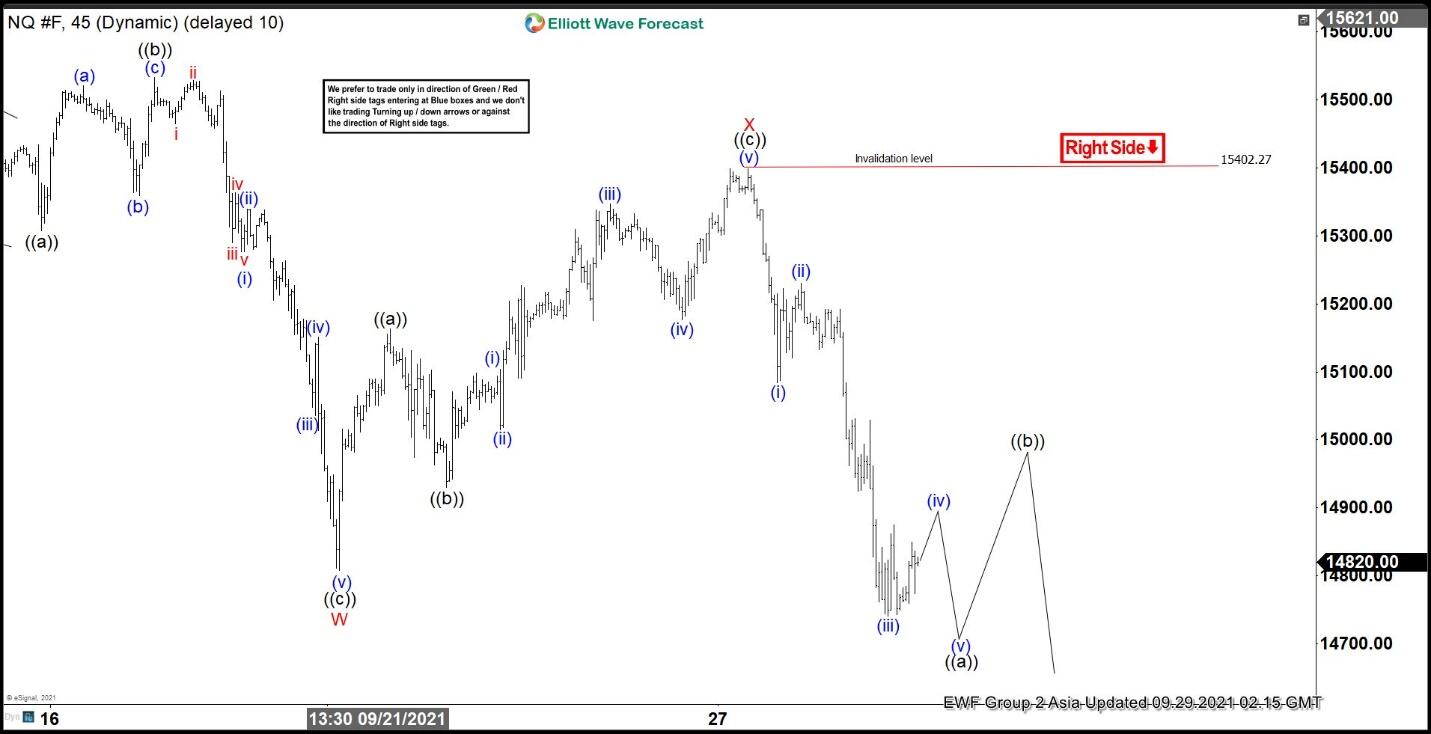 Short Term view in Nasdaq (NQ_F) suggests the decline from Sept 6, 2021 peak is unfolding as a double three Elliott Wave structure. Down from Sept 6 peak, wave W ended at 14807.5 as a zigzag structure. Wave ((a)) of W ended at 15307.75 and rally in wave ((b)) of W ended at 15532.50. The third leg wave ((c)) of W lower ended at 14807.50. Rally in wave X has also ended at 15402.27 as a zigzag structure. Up from wave W, wave ((a)) ended at 15163.25, pullback in wave ((b)) ended at 14930.50, and wave ((c)) of X ended at 15402.27.