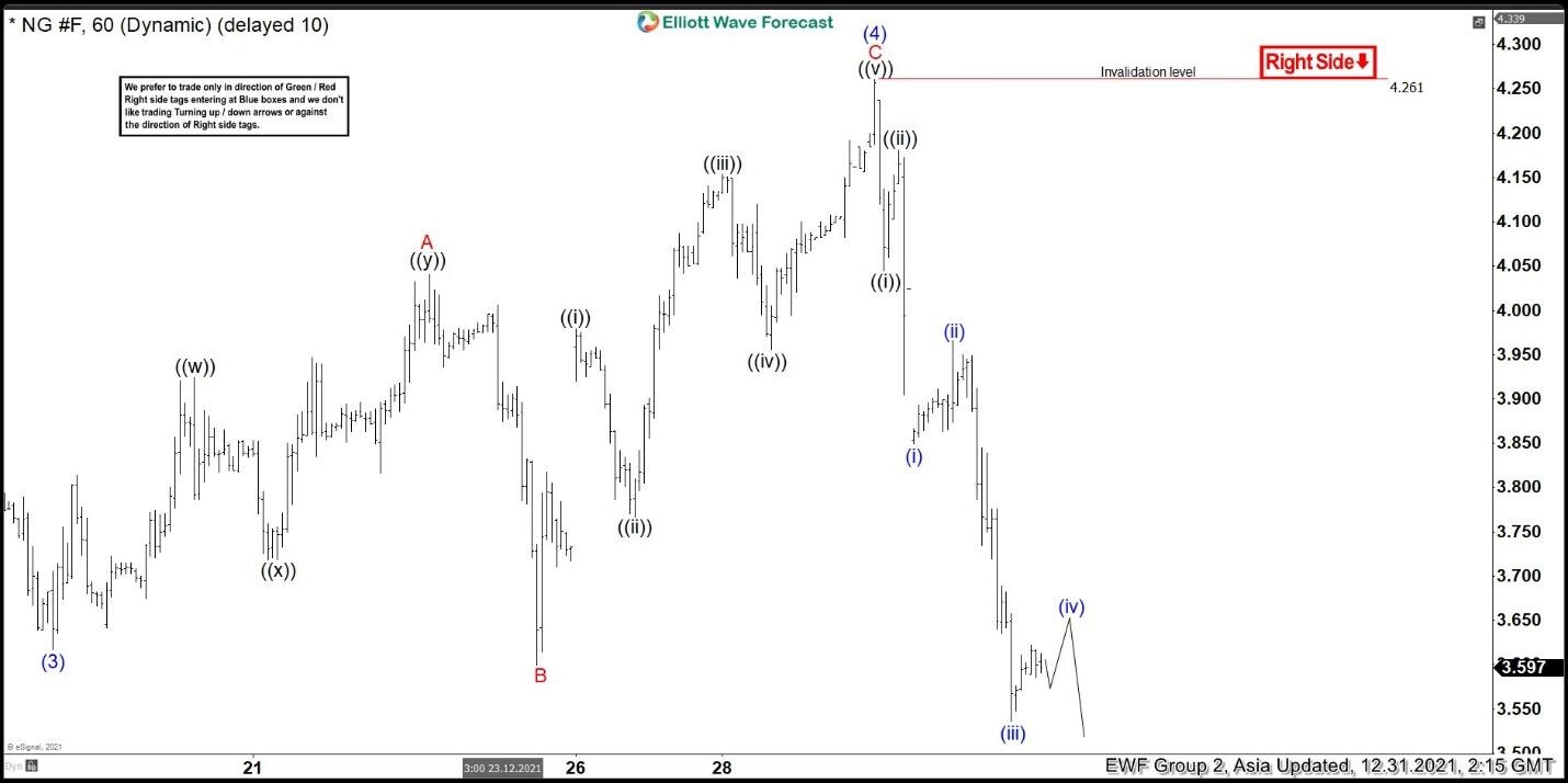 Elliott Wave View in Natural Gas (NG) suggests it is correcting cycle from June 22, 2020 low in larger degree 3, 7, or 11 swing. The decline is unfolding as a flat elliott wave structure. Down from October 6, 2021 peak (6.47), wave ((A)) ended at 4.825 and rally in wave ((B)) ended at 6.291. Wave ((C)) lower is in progress as a 5 waves impulse. The 1 hour chart below shows wave (3) of ((C)) ended at 3.617. Wave (4) of ((C)) bounce ended at 4.261 as an expanded flat structure.