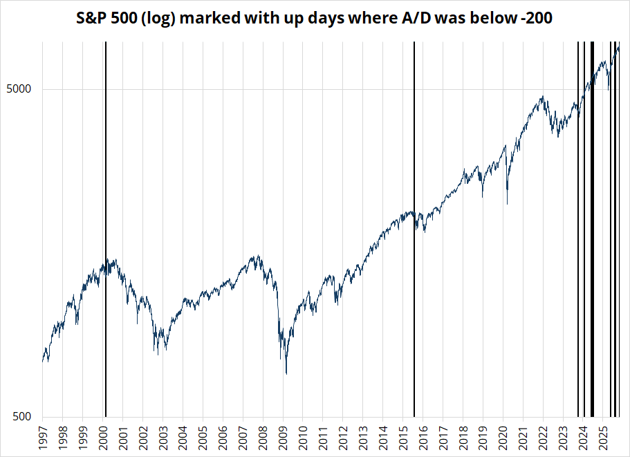 The advance/decline (A/D) line yesterday was -294. To give you a sense of the breadth situation, here are all the times you had a positive SPX day with A/D below -200.