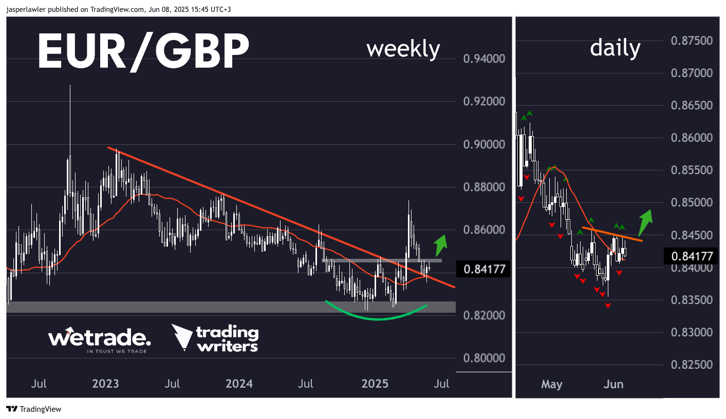 EUR/GBP made a long term breakout from a 2-year downtrend. It has now retraced most of the move to test the broken trendline and the 30-week moving average.