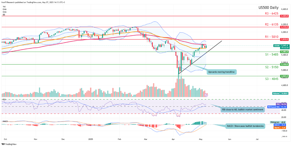 The Fed’s interest rate decision is set to occur later on today. The majority of market participants are currently anticipating the bank to remain on hold with FFF implying a 98.1% probability for such a scenario to materialize. Therefore, our attention now turns to the bank’s accompanying statement, in addition to Fed Chair Powell’s press conference following the bank’s decision. Before we get into what may play out in Powell’s presser and the banks accompanying statement, let’s take a look into last weeks financial releases and in particular the NFP figure for April and the US Core PCE rates for March, which are the Fed’s favourite tool for measuring inflationary pressures in the economy. The Core PCE rates showcased easing inflationary pressures and with the NFP figure showcasing a more resilient labour market than what was expected by economists, pressure on the Fed to aggressively cut rates may have eased. In our view, we would not be surprised to see the Fed implying that they may remain on hold for a prolonged period of time, which in turn could aid the dollar whilst potentially weighing on the US Equities markets. Yet, with inflation seemingly easing, some dovish elements could be incorporated into the banks' accompanying statement. Moreover, we would be interested to see if there will be references in the accompanying statement on the recent US trade policy and how that may factor into the bank’s economic outlook for the US economy.