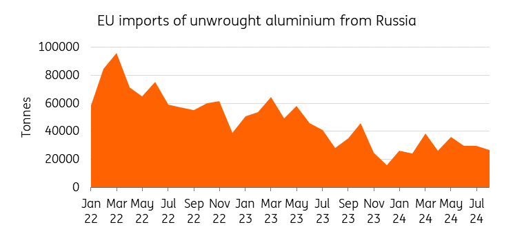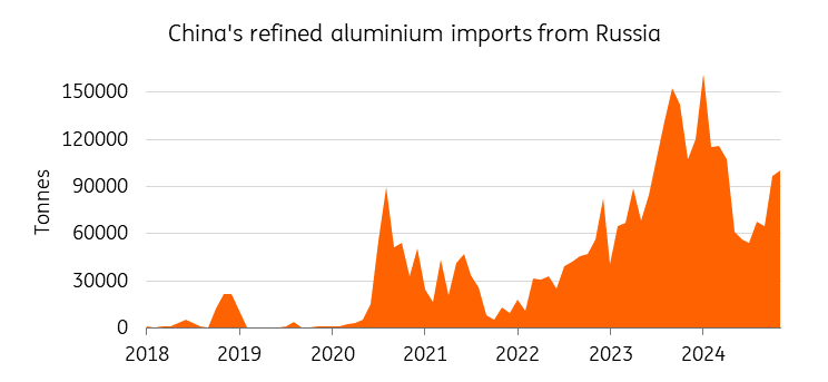 More Russian metal has been shipped to China, the world's biggest aluminium consumer. China imported 263,000 tonnes of primary aluminium from Russia in the first three quarters of 2024, accounting for 33% of the total imports from Russia last year. We expect this trend to continue in 2025.