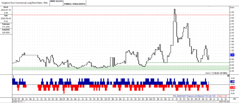The chart highlights the significant volatility in the Euro's commercial positioning compared to the British Pound. The recent surge to the 3.00 level indicated a period of strong Euro outperformance in terms of commercial positioning. However, the subsequent decline suggests a potential loss of this relative strength. Monitoring the current level around 1.13 in relation to the support level at 0.65 will be crucial to determine if the Euro can regain its upward momentum or if the Pound will gain further relative strength.