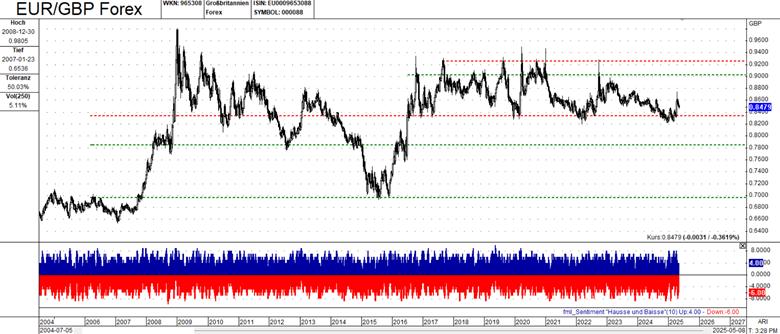 The EUR/GBP chart shows a period of significant volatility followed by a more prolonged period of consolidation. The pair is currently trading around 0.8475. The support and resistance levels at 0.8250 and 0.9225 are key levels to watch for potential price reactions. The sentiment histogram at the bottom suggests a generally balanced sentiment, with recent fluctuations. For a comprehensive analysis, it's essential to compare this chart with Charts 1 and 2. For instance, if we observe that a rise in the Euro's relative commercial strength (Charts 1 and 2) is accompanied by an upward movement in the EUR/GBP price, it would strengthen our conviction in a potential Euro bullish trend.