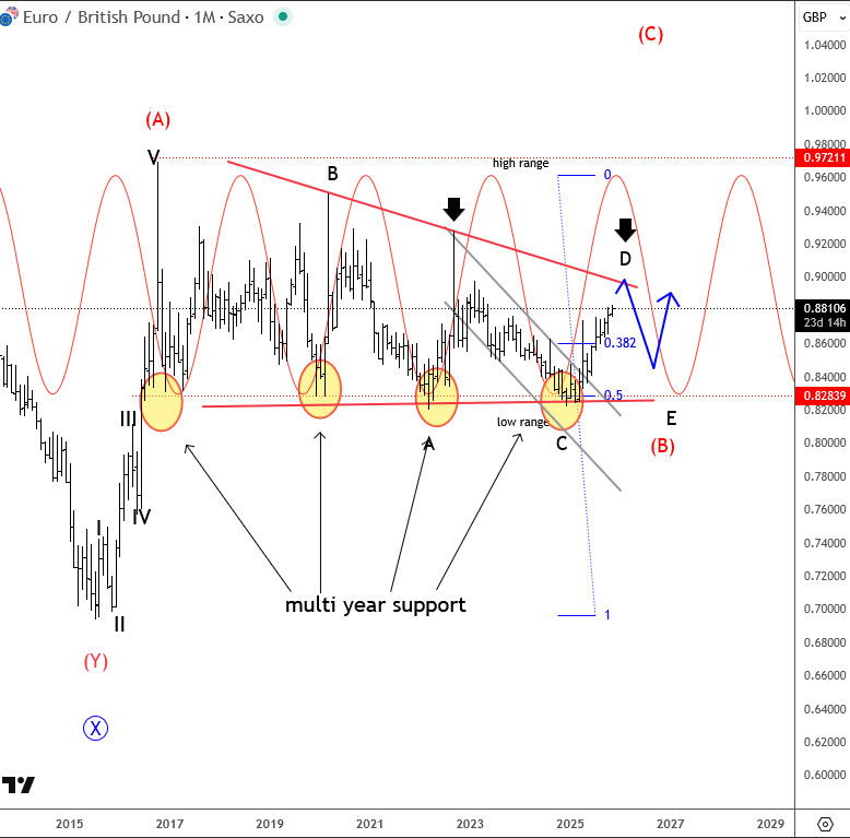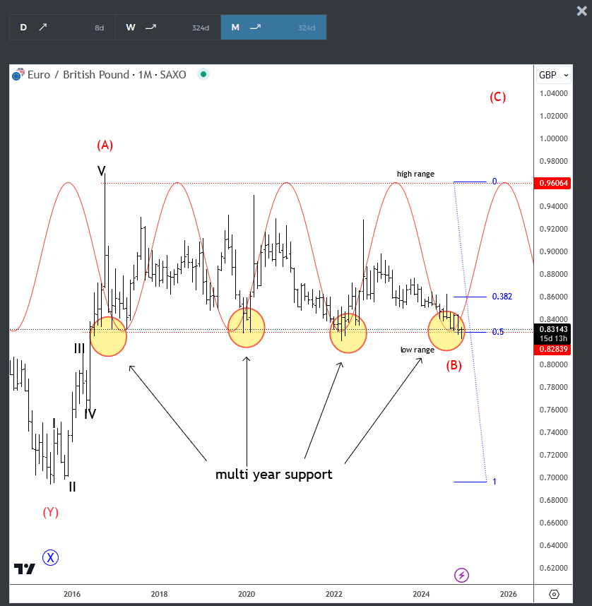 Today we’re focusing on EURGBP, which has mostly traded sideways since 2016. We’ve been pointing out a potential cycle bottom toward the end of 2024, suggesting an important reversal point supported by a strong technical level at 0.8282. This support area also aligns with the lower side of wave B within a complex correction. Since the decline from the 2016 highs wasn’t impulsive, that added confidence — from both a cycle and Elliott Wave perspective — that a recovery was due.