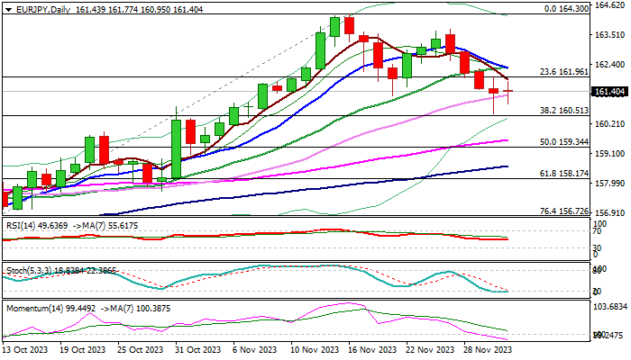 Firm break of 160.51 to confirm bearish near-term stance for extension through 160 (psychological) towards 159.34 (50% retracement of 154.38/164.30).