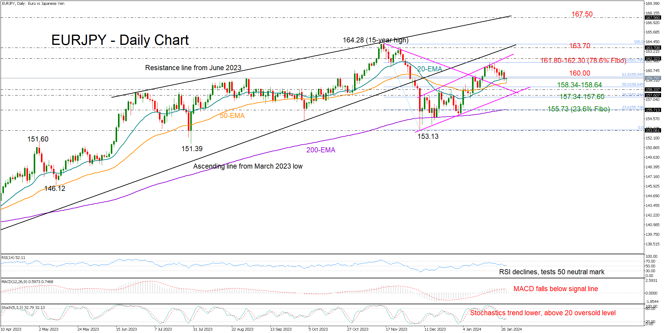 If the bulls manage to run back above the 160.00 mark, they may stage another battle near the 78.6% Fibonacci of 161.80 and the channel’s upper band at 162.30. A successful penetration higher could lose steam near November’s ceiling of 163.70-164.28. Should the rally continue, the pair could advance towards the resistance trendline, which connects the highs from June and November 2023 at 167.50.