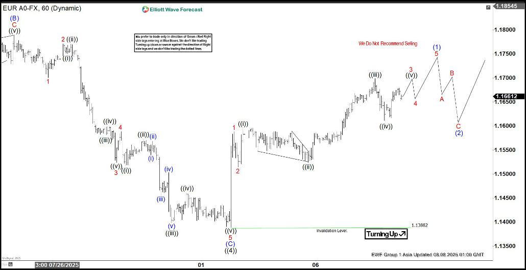 The EUR/USD pair exhibits an incomplete bullish sequence originating from the September 2022 low, targeting 1.191. The rally from this low unfolds as an impulse Elliott Wave structure. Wave ((1)) concluded at 1.1275, followed by a pullback in wave ((2)) that ended at 1.0177. The pair has since resumed its upward trajectory in wave ((3)), reaching 1.183. Subsequent pullback in wave ((4)) completed at 1.139, as illustrated in the 1-hour chart. The internal structure of wave ((4)) formed a zigzag pattern. From the peak of wave ((3)), wave (A) declined to 1.1554. Wave (B) rallied to 1.1788, and wave (C) descended to 1.1388, finalizing wave ((4)).