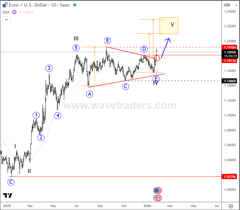 On the daily chart, EUR/USD is breaking higher out of the triangle, signaling the start of projected wave V. Based on standard triangle measurements and Elliott Wave guidelines, this final advance has room to extend toward the 1.20–1.23 target zone, which represents the triangle’s measured move and a major technical objective.