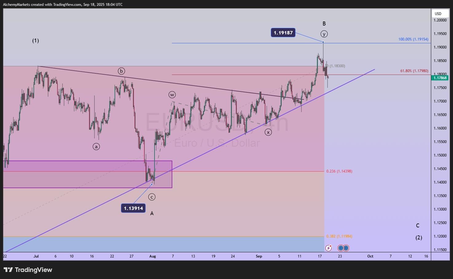 EUR/USD has rallied to fresh 4-year highs on the heels of the Fed’s 25 basis point rate cut. Yesterday’s high may have printed the end to a corrective rally, leading to a decline in an ongoing wave 2.