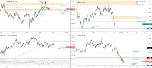The H1 Quasimodo support at $1.3618 forms a reasonable downside target, arranged just north of the noted Quasimodo support on the daily timeframe.