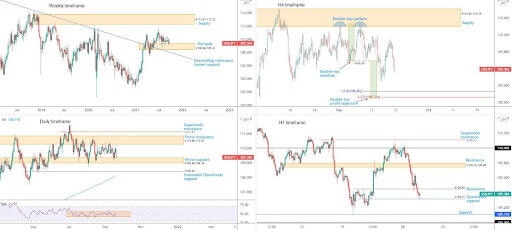 In keeping with the H4 timeframe, booking additional losses is possibly on the cards until the double-top pattern’s (¥110.44) profit target around ¥108.71. Still, to reach the aforementioned profit target, sellers must marginally defeat the daily timeframe’s range support at ¥108.96-109.34 and take on any bullish interest from weekly demand at ¥108.40-109.41.