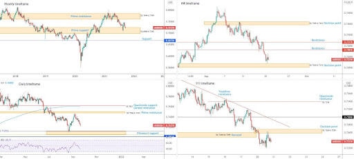 Lower on the curve, a H1 decision point at $0.7269-0.7259 elbowed into the spotlight, an area formed in the early hours of Monday which saw price tunnel through demand at $0.7248-$0.7259. Continued interest to the downside has $0.72 to target.