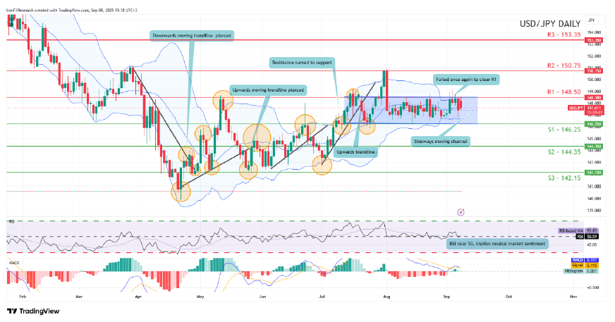 USD/JPY appears to be moving in a sideways fashion, after failing on numerous occasions to clear our 148.50 (R1) resistance line. Interestingly, Japan’s Prime Minister Ishida resigned yesterday and thus the political instability may have weighed on the JPY, although that does not appear to be the case as seen by our chart. We opt for a sideways bias for the pair, and supporting our case is the RSI indicator below our chart, which currently registers a figure near 50, implying a neutral market sentiment. For our sideways bias to be maintained, we would require the pair to remain confined between our 146.25 (S1) and our 148.50 (R1) resistance line. On the other hand, for a bearish outlook we would require a clear break below our 146.25 (S1) support level with the next possible target for the bears being the 144.35 (S2) support line. Lastly, for a bullish outlook we would a clear break above the 148.50 (R1) resistance level with the next possible target for the bulls being the 150.75 (R2) resistance line.