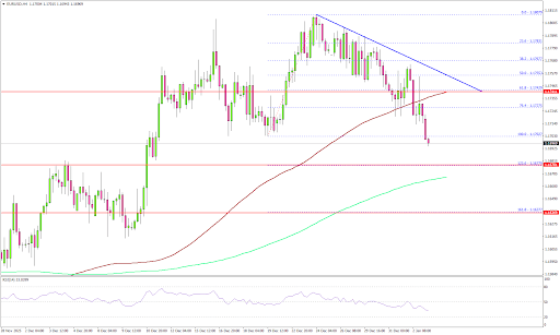 Looking at the 4-hour chart, the pair declined below the 1.1720 support level and the 100 simple moving average (red, 4-hour). It is now showing bearish signs below the last swing low of 1.1702. If the bears remain in action, the pair could continue to move down.
