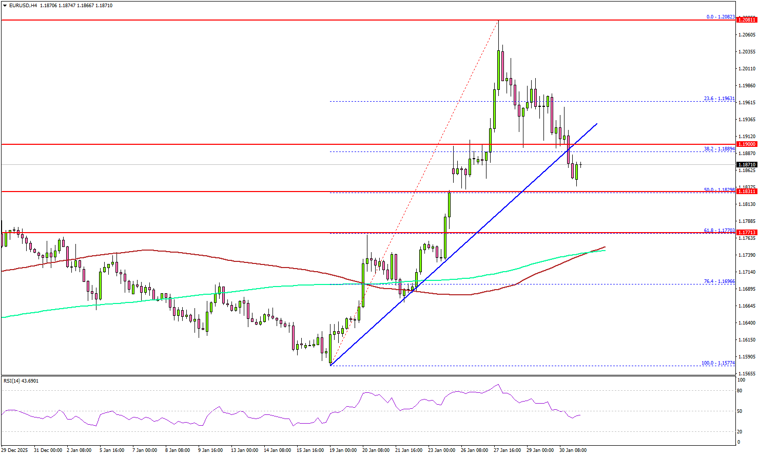 - It traded below a key bullish trend line with support at 1.1880 on the 4-hour chart.