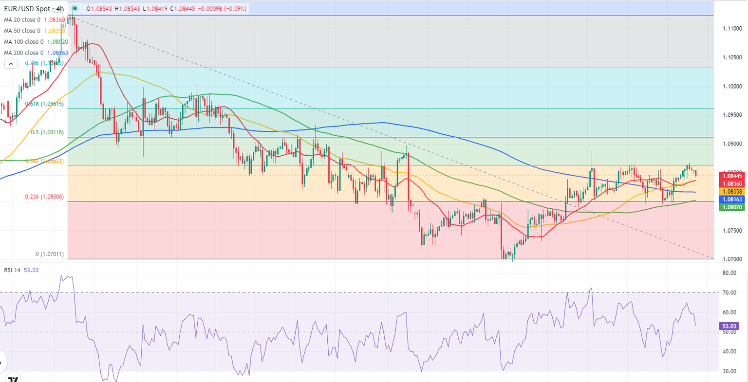EUR/USD reversed its direction after testing 1.0860 (Fibonacci 38.2% retracement of the latest downtrend), confirming this level as strong resistance. On the downside, 1.0835 (200-period Simple Moving Average (SMA) on the 4-hour chart) aligns as first support before 1.0800 (psychological level, Fibonacci 23.6% retracement) and 1.0760 (static level).