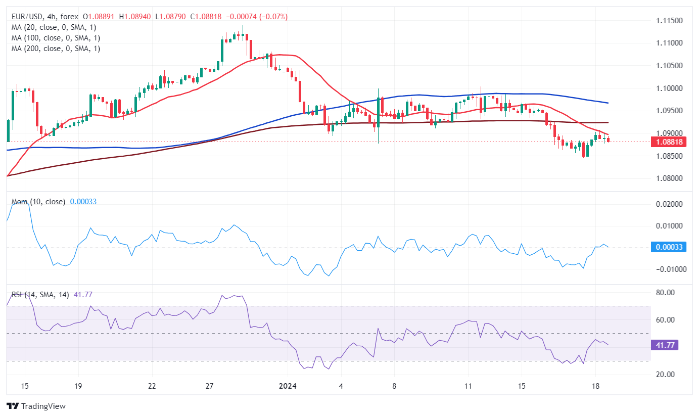 The EUR/USD pair trades little changed for a second consecutive day, changing hands at around 1.0880 ahead of the United States (US) opening. The trading range is limited, as EUR/USD peaked at 1.0906, while it met a bottom at 1.0876. The soft tone of Asian share markets limited the upside for the Euro, while demand for the US Dollar receded on the back of more stable government bond yields that put a halt to their latest rally.