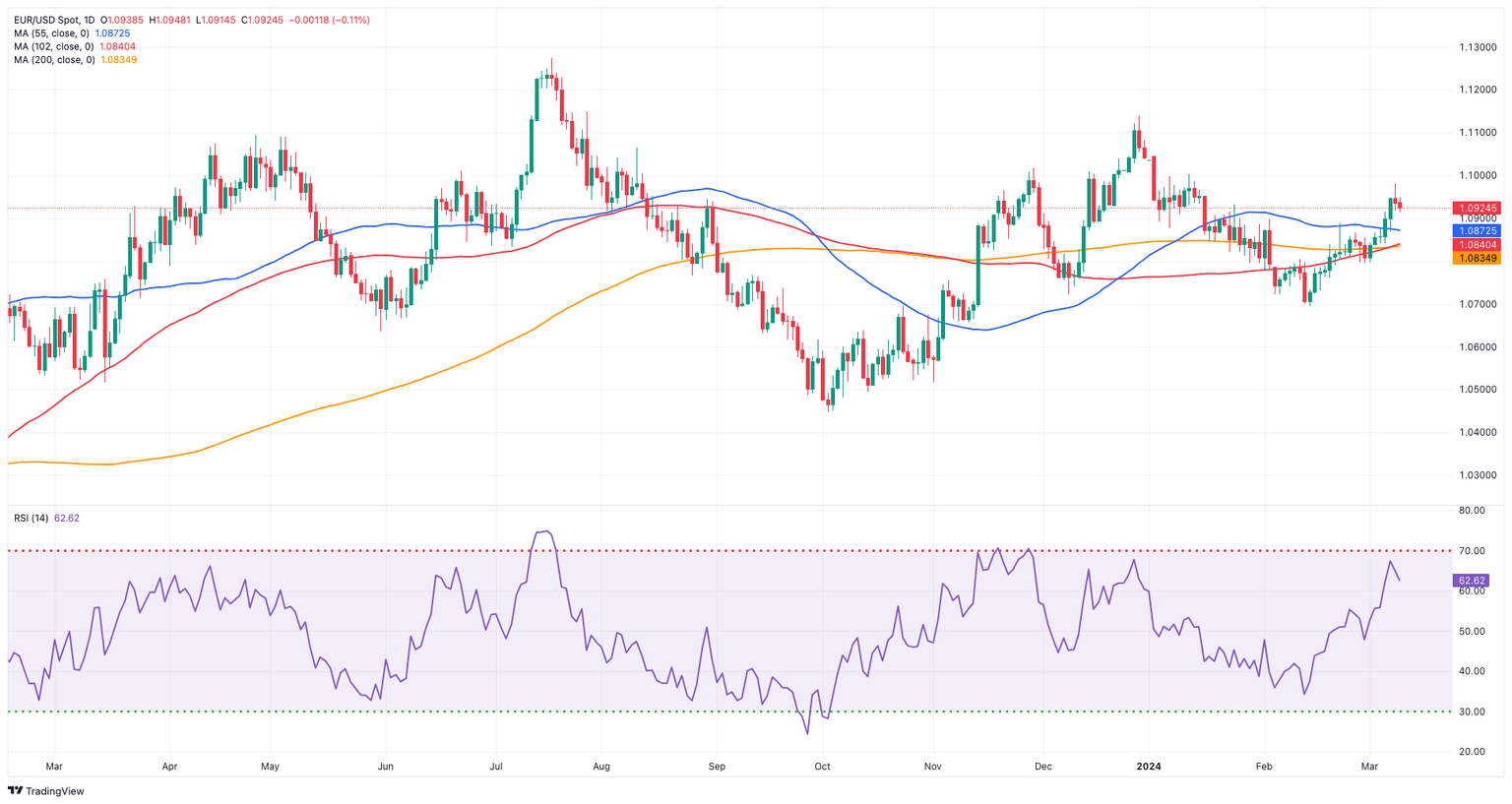The surpass of the March peak of 1.0981 (March 8) could encourage EUR/USD to attempt an assault of the weekly high of 1.0998 (January 11), which reinforces the psychological barrier of 1.1000 and comes ahead of the December 2023 top of 1.1139 (December 28).