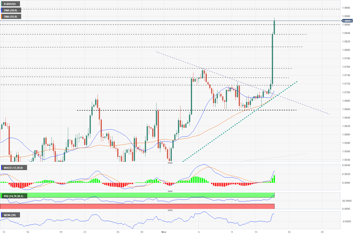 The daily chart shows the EUR/USD pair rising above the 100-day and 200-day Simple Moving Averages (SMA) for the first time since August. Additionally, the 20-day SMA crosses above the 55-day SMA, further supporting the bullish outlook. The Relative Strength Index (RSI) is in overbought territory, but there are no signs of exhaustion.
