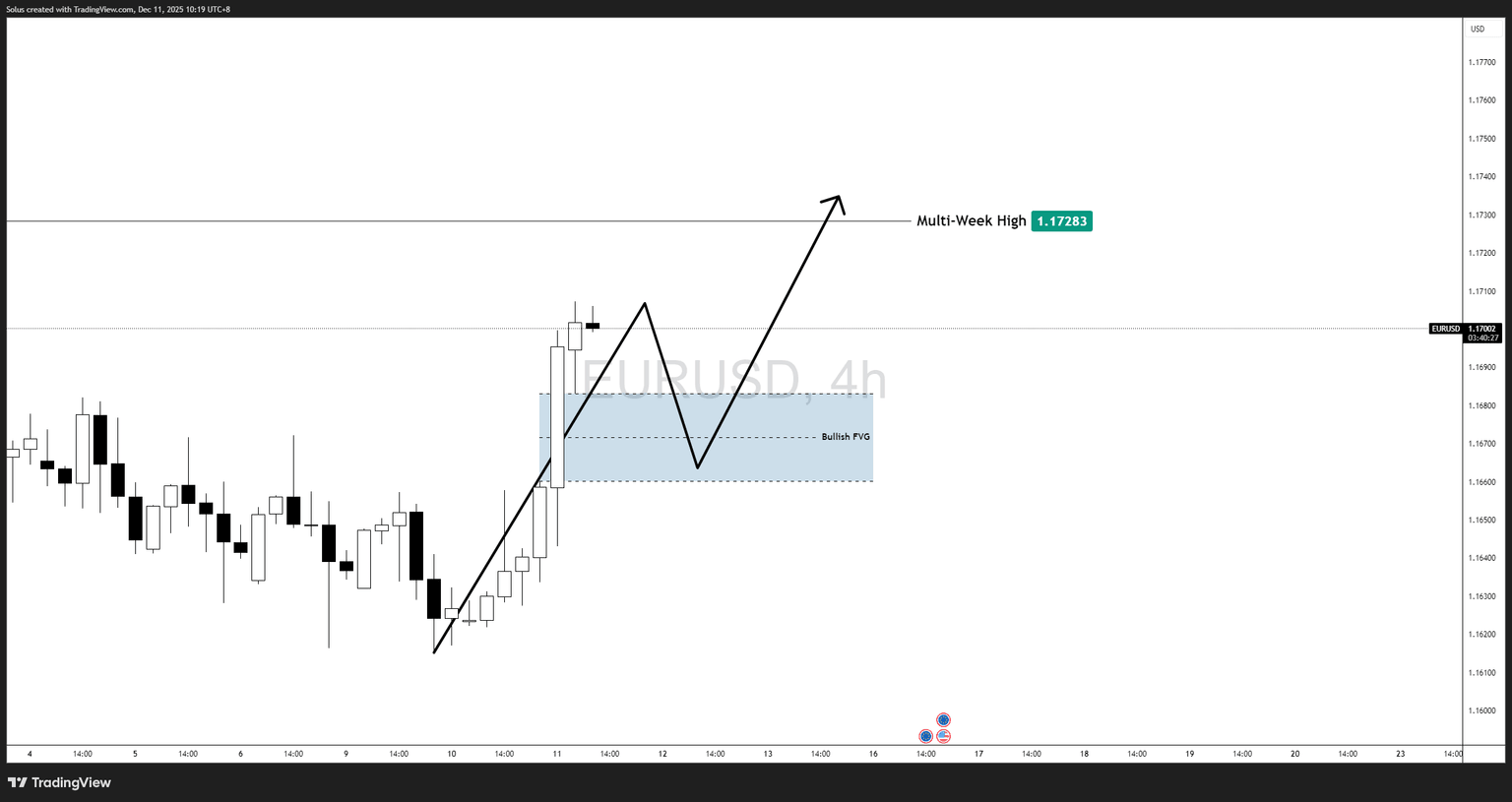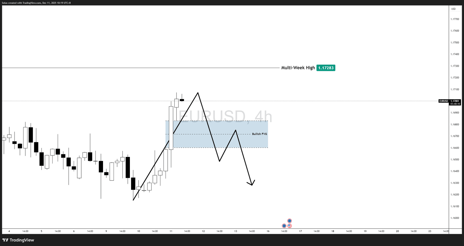 Your 4H charts show a newly formed bullish Fair Value Gap (FVG) following the impulsive rally post-FOMC. Price is currently sitting above the multi-week high around 1.1728, but short-term exhaustion is visible.