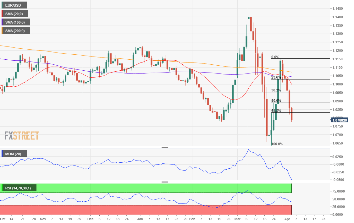 The EUR/USD pair is trading at around 1.0790, below the 61.8% retracement of its previous weekly recovery at around 1.0830, an immediate resistance level. The pair is back in its bearish path, and at risk of falling beyond the yearly low at 1.0635.