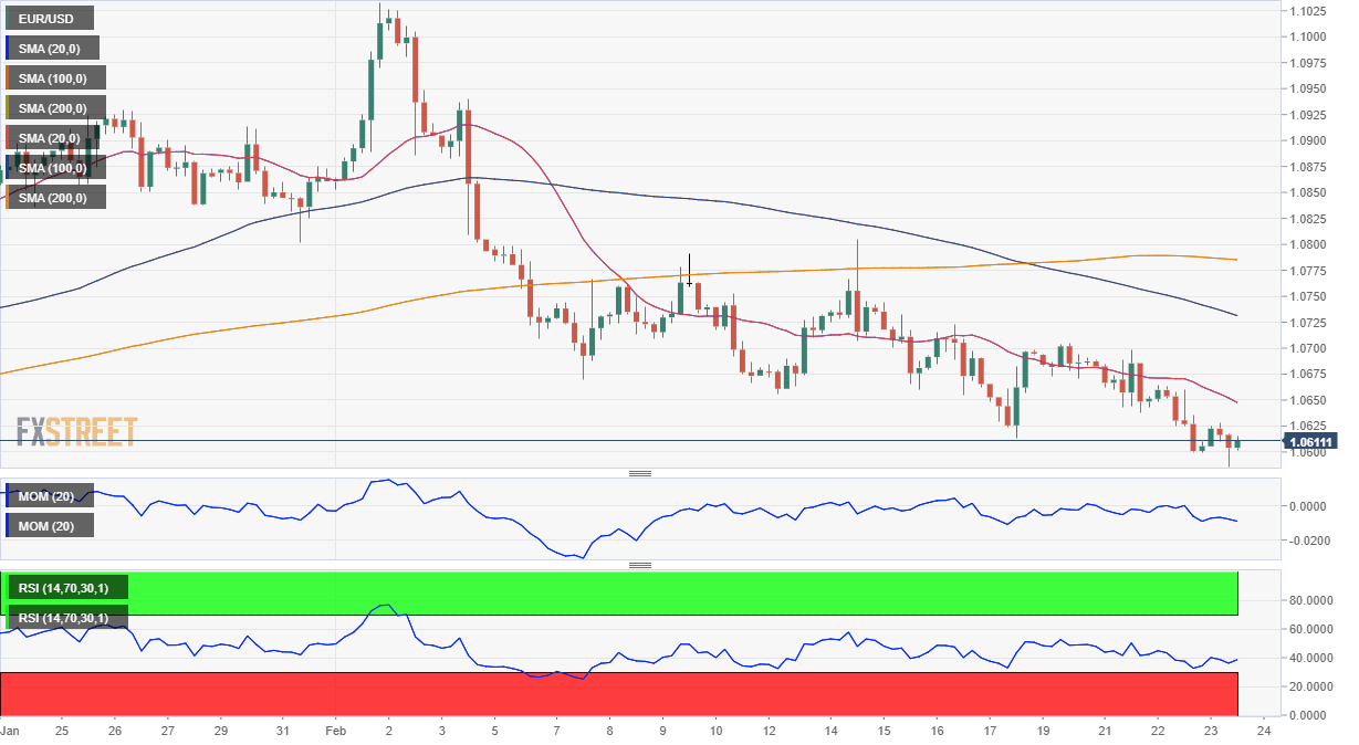 The EUR/USD pair fell through the 1.0600 threshold and posted a fresh February low of 1.0585, as the Greenback continues strengthening on the back of hawkish US Federal Reserve (Fed) prospects. The United States central bank released the Federal Open Market Committee (FOMC) Meeting Minutes on Wednesday, which were more hawkish than anticipated.