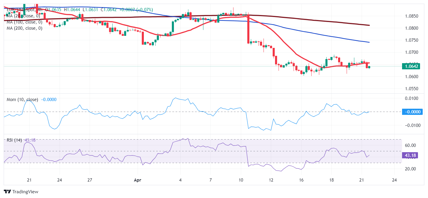 The EUR/USD pair is under mild selling pressure at the beginning of the week, trading in the 1.0640 price zone in the European session. The US Dollar started the week with a soft tone amid easing tensions in the Middle East, but recovers the ground lost. Israel decided to take a moderated retaliation, which Iran agreed not to respond to. As a result, market players shifted the focus to upcoming macroeconomic data and their potential effects on central banks’ decisions.