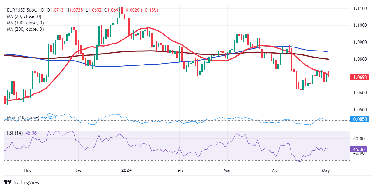 The USD remains on the back foot against most major rivals, with EUR/USD hovering around 1.0700 ahead of Wall Street’s opening. The daily chart offers a neutral picture, although the risk skews to the downside. The pair is still battling to recover above a bearish 20 Simple Moving Average (SMA) to no avail. At the same time, the 100 and 200 SMAs gain downward traction far above the longer ones. Finally, the Momentum indicator aims higher within neutral levels, while the Relative Strength Index (RSI) indicator suggests limited buying interest, consolidating at around 45.