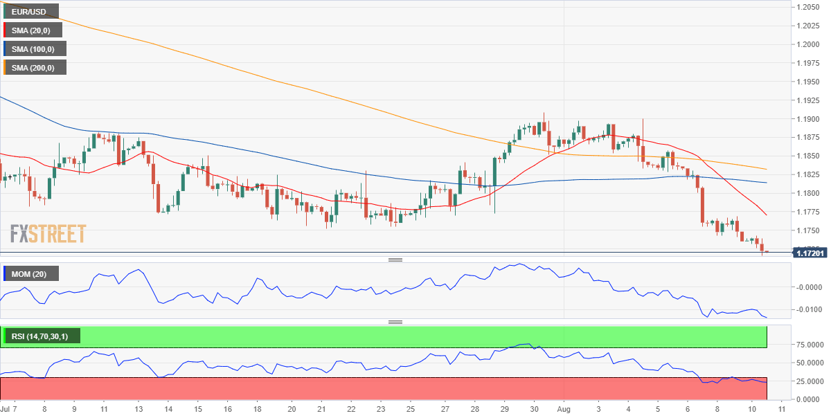 The EUR/USD pair trades near a fresh multi-month low at 1.1715, as demand for the greenback remains solid, while the shared currency was affected by poor local data. Germany released the August ZEW Survey, which showed that Economic Sentiment in the country sharply contracted to 40.4 vs the expected 56.7. The assessment of the current situation printed at 29.3, below the 30 forecast. For the EU, Economic Sentiment plunged to 42.7 from 61.2, well below the 72 expected.