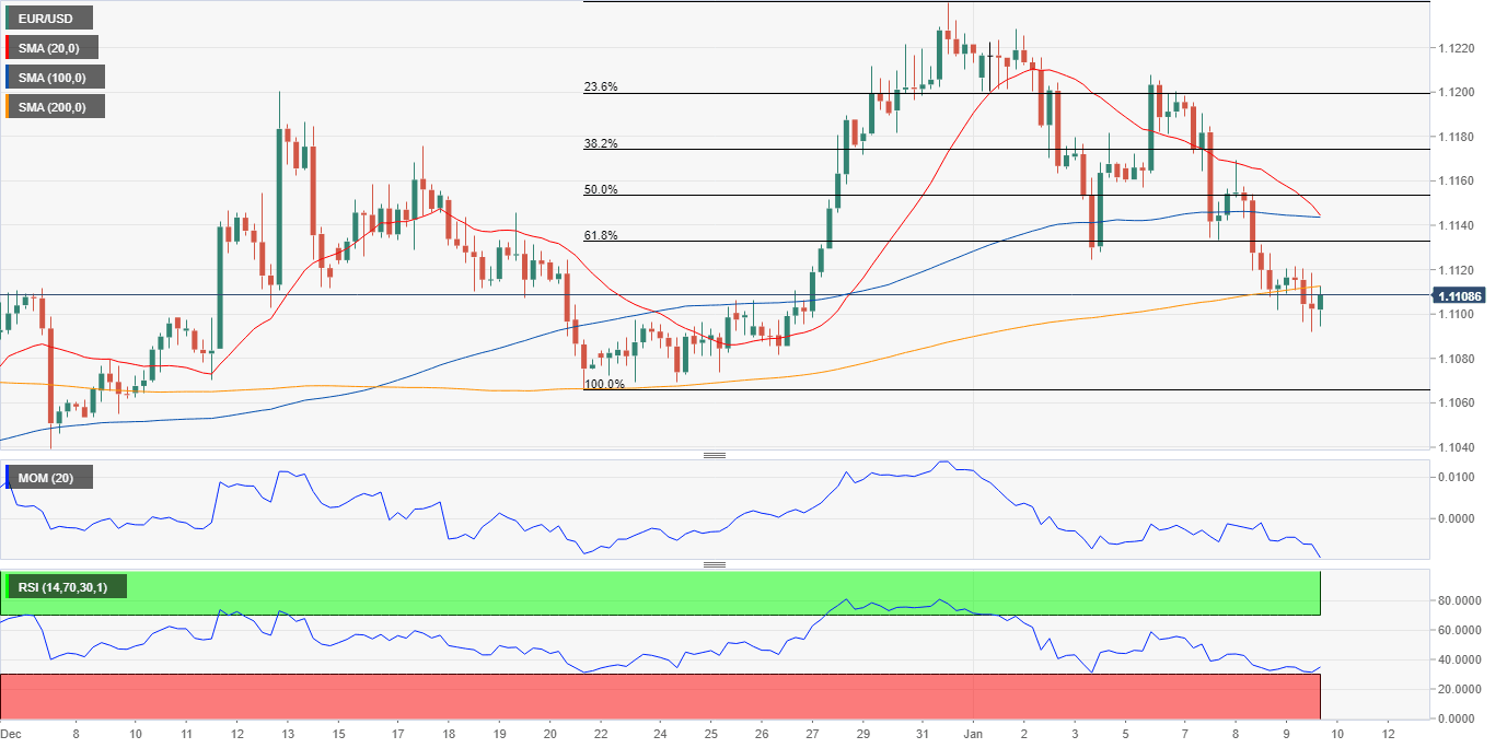 - EUR/USD struggling with the 1.1100 level, bearish in the short-term.