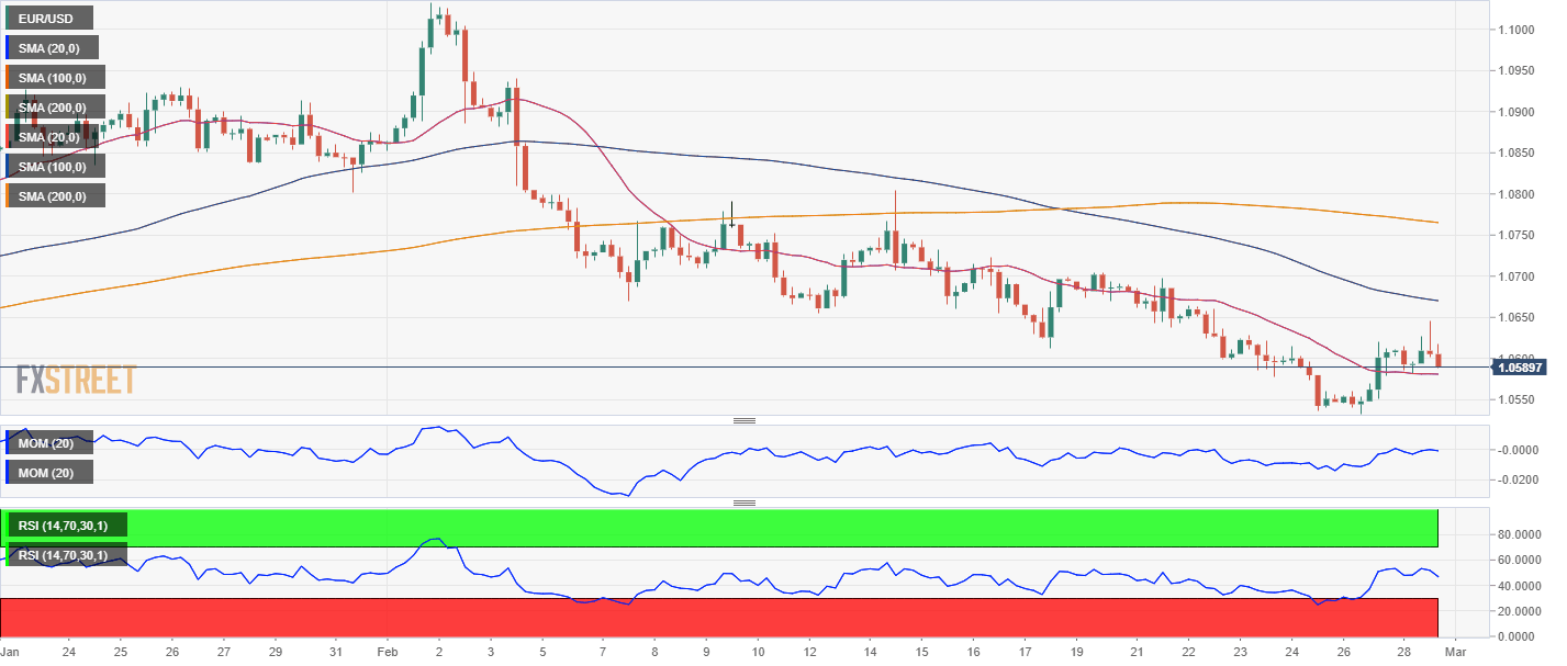 The EUR/USD pair advanced on Tuesday to reach 1.0644 early in the American session, later changing direction to end the day with modest losses around 1.0590. The Euro surged during London trading hours as hotter-than-expected Spanish and French inflation figures fueled speculation the European Central Bank (ECB) will continue hiking rates at least until early 2024. Hawkish comments from ECB officials further fueled the advance. ECB Chief Economist Philip Lane said on Tuesday that the “case for 50 bps rate hike in March remains solid,” reaffirming the well-known central bank message. Market players now see ECB’s terminal rate at 4%.
