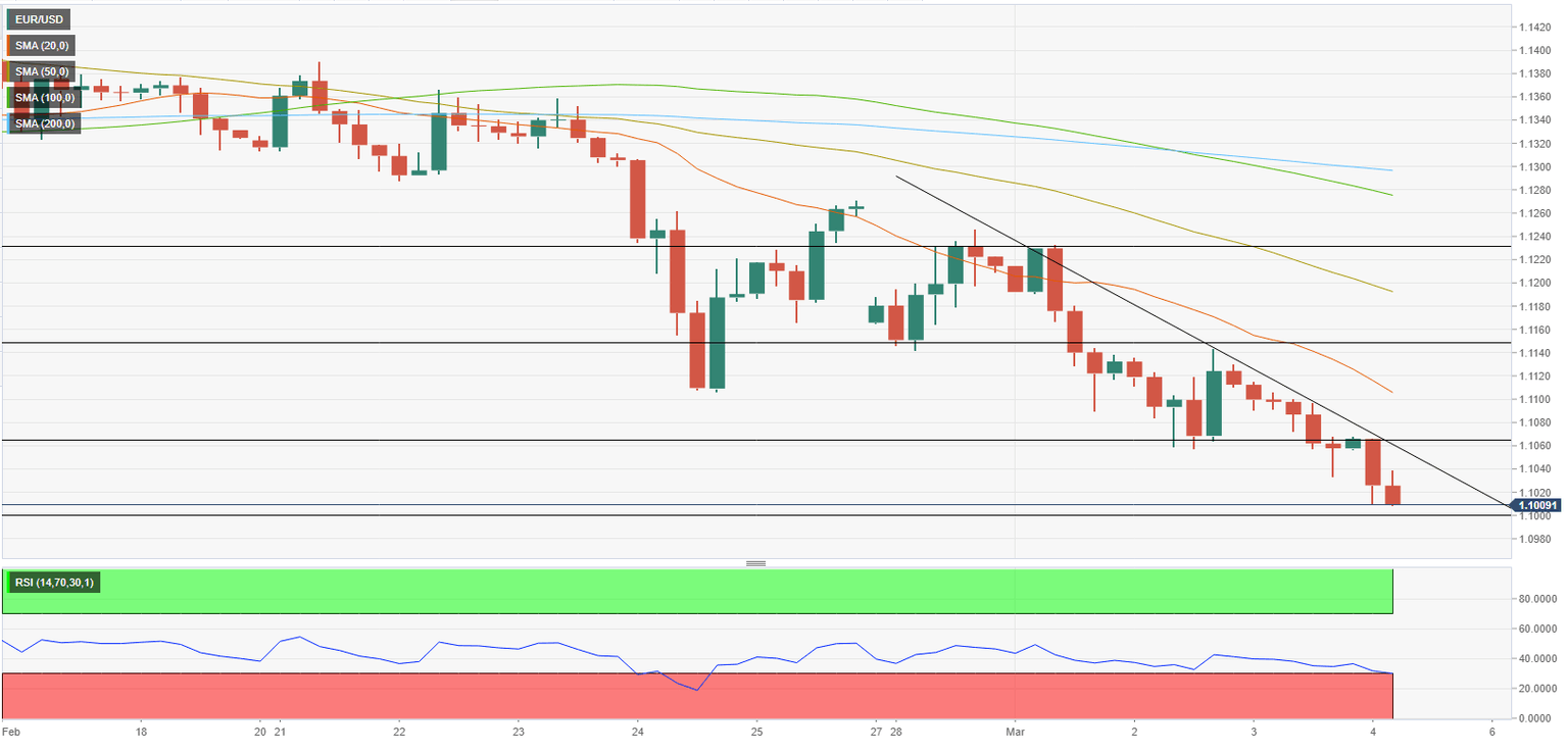 EUR/USD has met renewed bearish pressure during the Asian trading hours and has extended its weekly decline to a fresh 22-month low near 1.1000. Unless the pair stages a technical correction and reclaims 1.1060, buyers are unlikely to be convinced of a steady rebound and show interest in the euro.