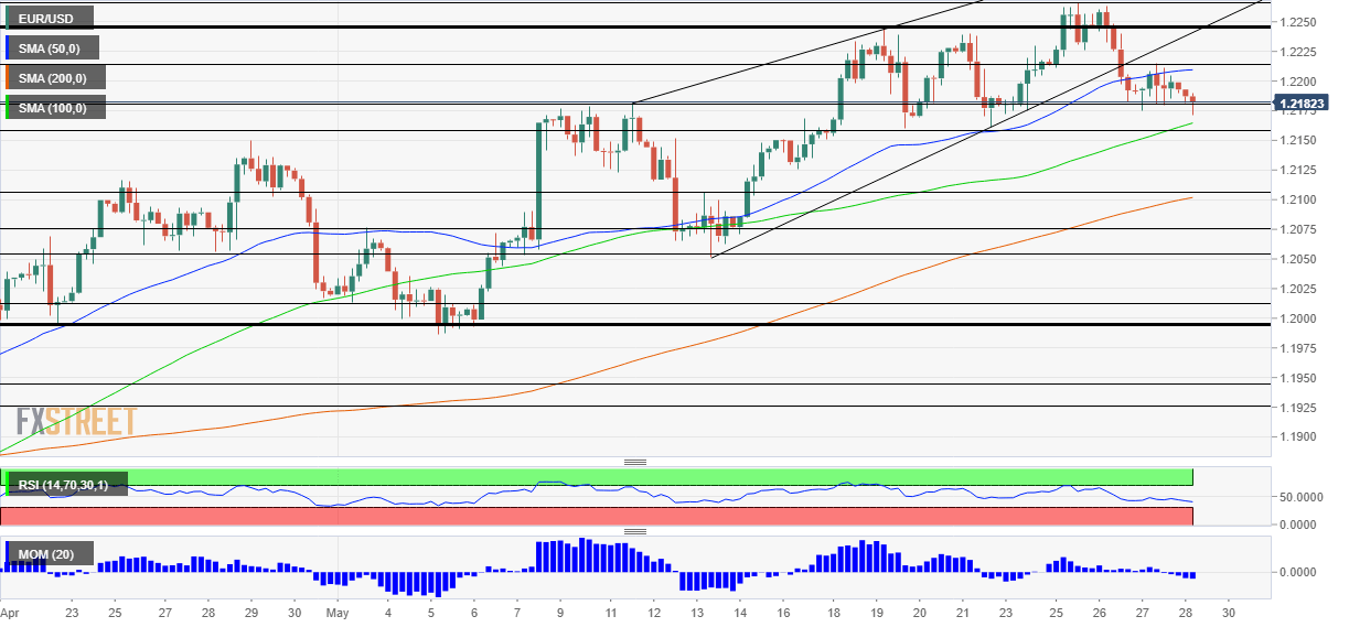 Euro/dollar has dropped below the 50 Simple Moving Average on the four-hour chart and momentum has turned negative. Bulls may find some solace in the fact that the currency pair still trades above the 100 and 200 SMAs. Nevertheless, bears are gaining ground.