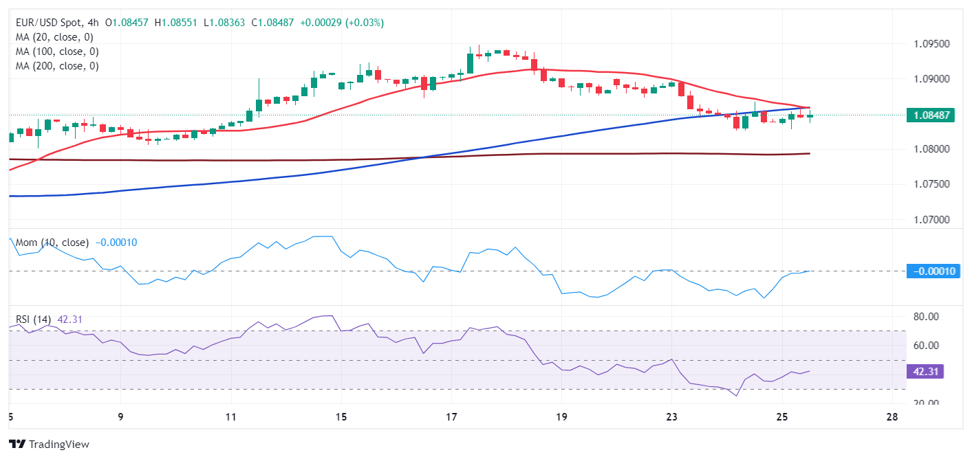The EUR/USD pair posts modest intraday gains, battling to extend gains beyond the 1.0850 region. In the daily chart, the pair is stuck around a bullish 20 Simple Moving Average (SMA), while the longer moving averages remain directionless, just below the 1.0800 mark. Finally, technical indicators have lost their bearish slopes right above their midlines, indicating receding selling interest.