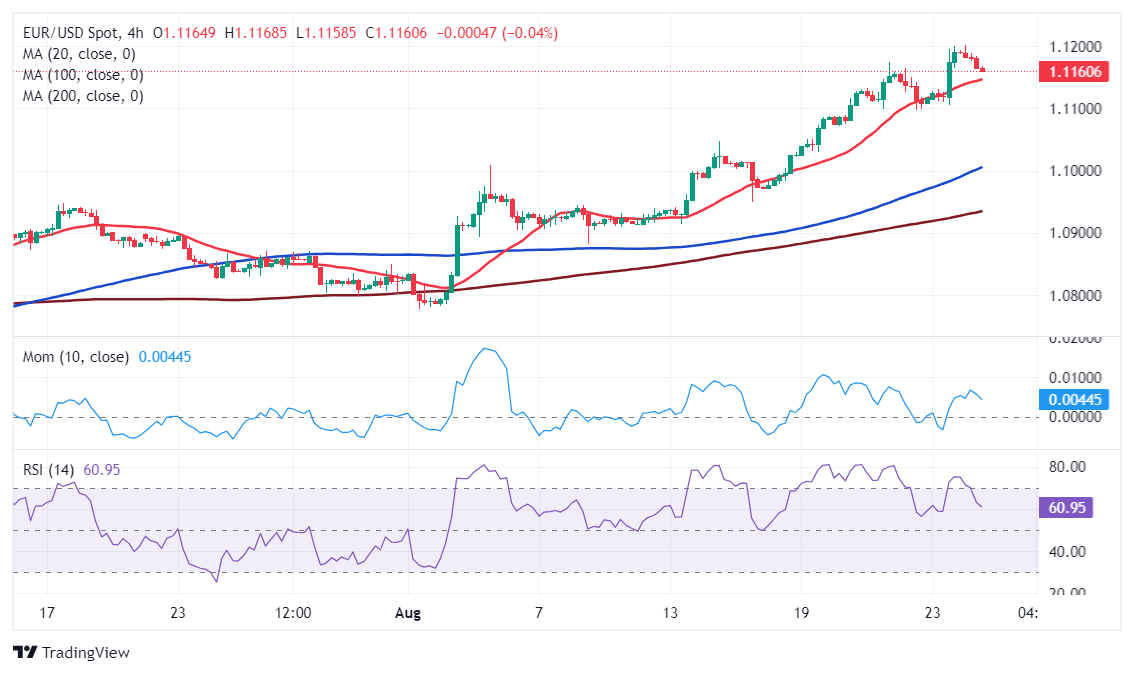 The EUR/USD pair eases from its recent highs at around 1.1200 despite persistent risk appetite. The pair rallied on Friday following comments from Federal Reserve (Fed) Chairman Jerome Powell at the Jackson Hole Symposium. Powell kept paving the way for a September interest rate cut, saying that “the time has come for policy to adjust.” As usual, he maintained a dose of caution, adding that the timing and pace of rate cuts will depend on “ incoming data, the evolving outlook, and the balance of risks.”