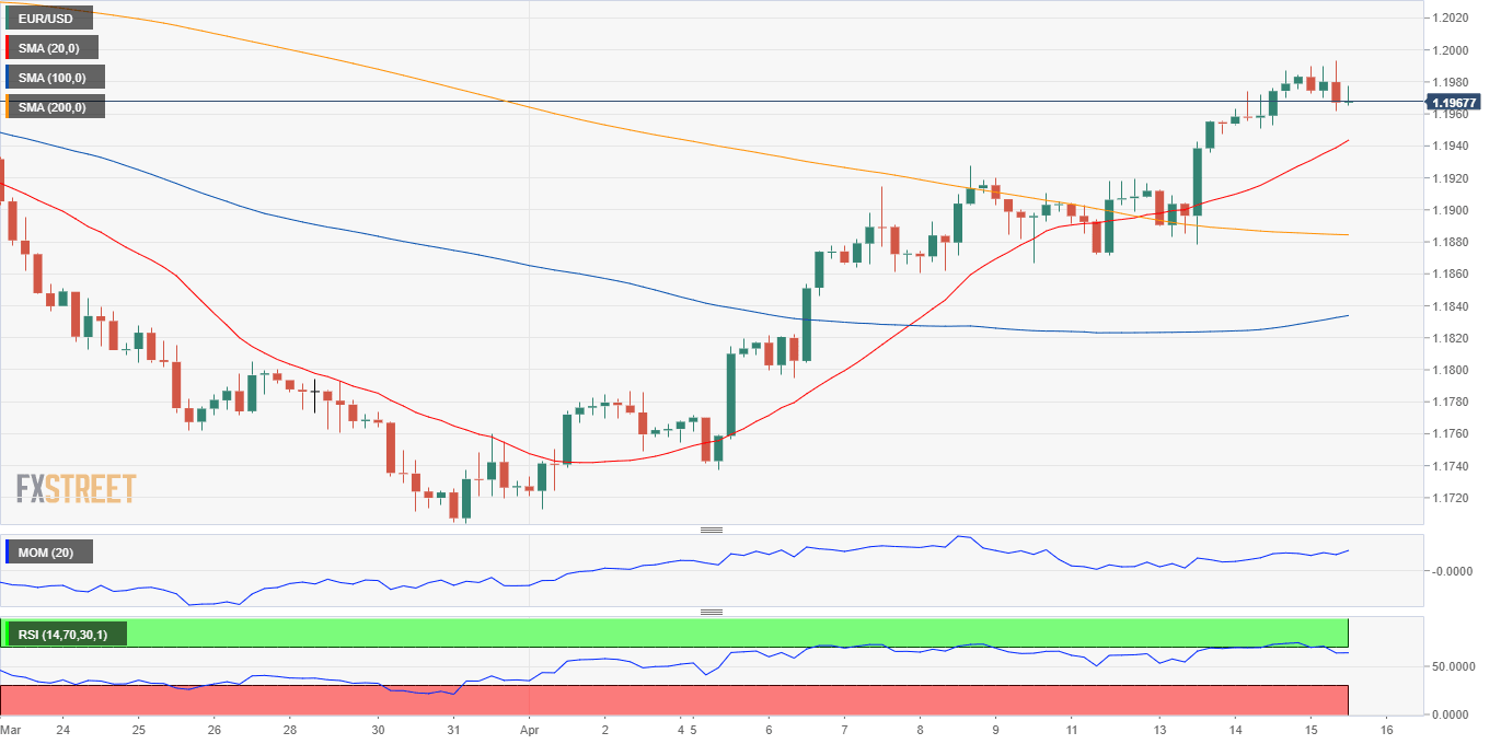 The EUR/USD pair advanced to 1.1992 this Thursday, a fresh April high, as risk appetite persisted throughout the first half of the day. The dollar posted a modest advance ahead of US data releases, although other high-yielding assets retained their strength. Meanwhile, the dollar fell even against safe-haven gold and yen.