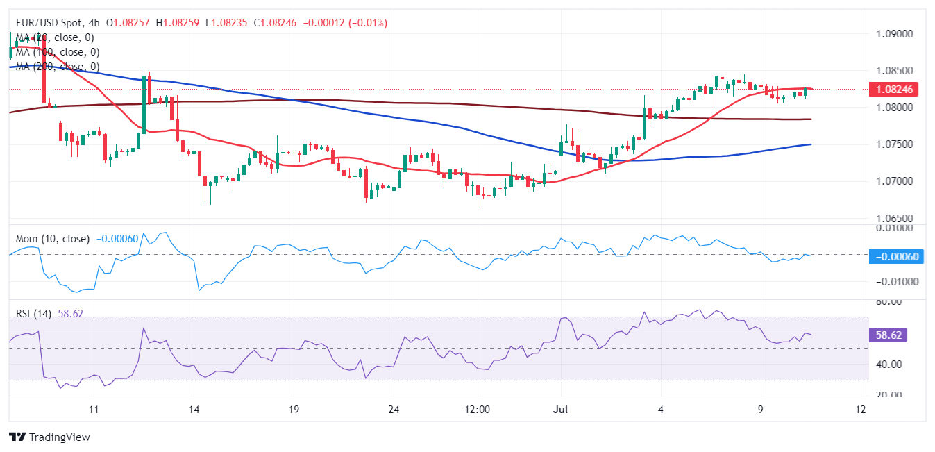 The EUR/USD pair trades uneventfully at around 1.0820 on Wednesday, still confined to a tight intraday range, with the US Dollar maintaining the soft tone across the FX board. Financial markets were unable to take directional clues from Federal Reserve (Fed) Chairman Jerome Powell’s testimony before Congress. Powell´s words on monetary policy resumed the hawkish tone that he partially abandoned in Sintra, triggering a short-lived USD run.