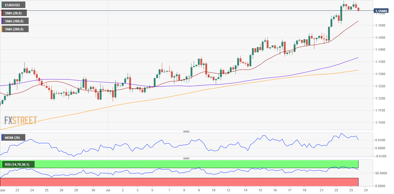The EUR/USD pair is trading at daily lows around 1.1560, correcting overbought conditions but without signs of a bearish extension coming up next. The 4-hour chart shows that the 20 SMA maintains its firm bullish slope far above the larger ones, which also advance. Technical indicators, in the meantime, barely retreated from overbought levels. The corrective decline could continue on a break below 1.1545, a former high and the immediate support, while bulls will increase their bets on a break above 1.1620.
