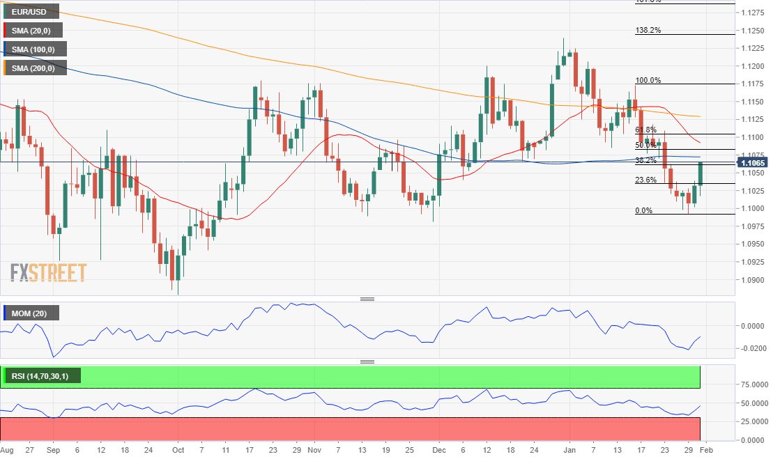 The EUR/USD pair is trading around the 38.2% retracement of its latest daily slump, measured between 1.1172 and 1.0991 at 1.1060, the immediate resistance. Therefore, the latest advance could be considered corrective.