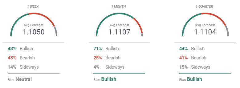 The FXStreet Forecast Poll shows that the market is not willing to resume the dollar’s buying, as the pair is seen neutral-to-bullish in the upcoming weeks. The weekly perspective shows that sentiment is neutral as the number of those betting for a decline matches the one of those waiting for a recovery. Bulls take over in the monthly view, increasing to 71%, although the average target is barely above the 1.1100 figure. The number of those betting for a sustained advance drops in the quarterly perspective, down to 44%, with the average target stuck around 1.1100.