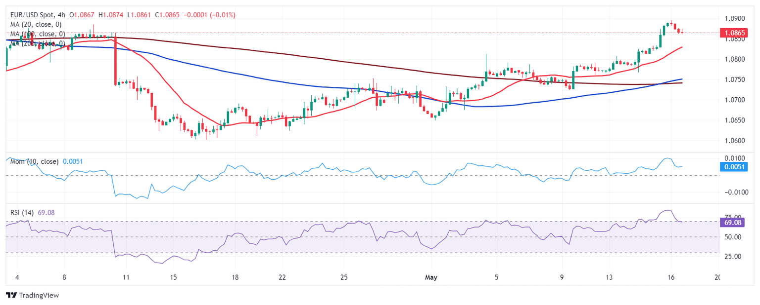 The EUR/USD pair peaked at 1.0894 early Thursday as the US Dollar extended its inflation-inspired decline. The United States (US) reported on Wednesday that the Consumer Price Index (CPI) rose 3.4% YoY in April from 3.5% in March, while the core annual reading printed at 3.6%, easing from the previous 3.8%, but also in line with the market forecast. Finally, the monthly CPI rose 0.3%, slightly below the expected 0.4%. The news put the Greenback under strong selling pressure, which extended throughout the Asian session.