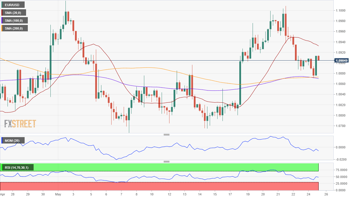 The EUR/USD pair hovers around the 1.0900 level in a quiet start to the week, with the shared currency founding support in a better than anticipated German IFO Survey. According to it, the Business Climate in the country improved in May to 79.5 from 74.2. Expectations also improved, although the assessment of the current situation worsened. Holidays in the UK and the US keep the macroeconomic calendar empty and majors confined to familiar levels.