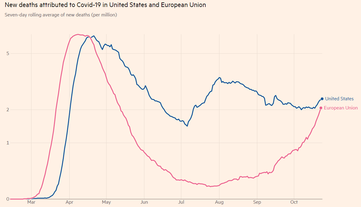 Winter is coming but the autumn is already awful. Coronavirus is raging in the old continent and weighing on the euro, pushing it off the highs. France has reported a daily record of cases on Saturday – only to surpass it on Sunday and reach 52,000. Per population, Belgium and the Netherlands are doing worse than their southern neighbor.