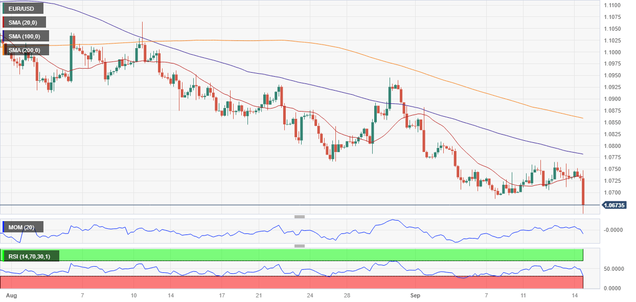 The EUR/USD pair plummeted to 1.0654, its lowest since last May. The daily chart for the pair shows that the bearish case is strong, as EUR/USD slid further below its moving averages, with the 20 Simple Moving Average (SMA) accelerating south below the longer ones. At the same time, technical indicators gain downward momentum within negative levels, in line with lower lows.