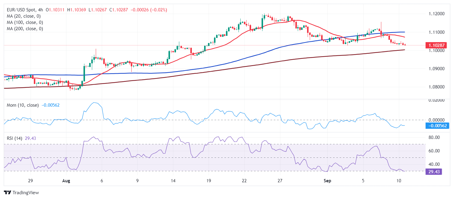 - EUR/USD pressures the 1.1020 support area, aims to break below it.
