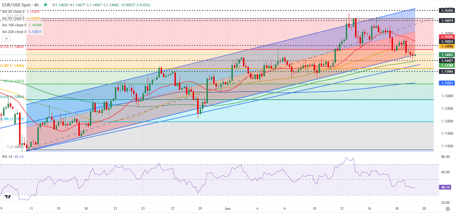 On the downside, the 100-period Simple Moving Average (SMA) aligns as the immediate support level at 1.1440 before 1.1400 (Fibonacci 38.2% retracement of the latest uptrend) and 1.1350 (200-period SMA, Fibonacci 50% retracement).