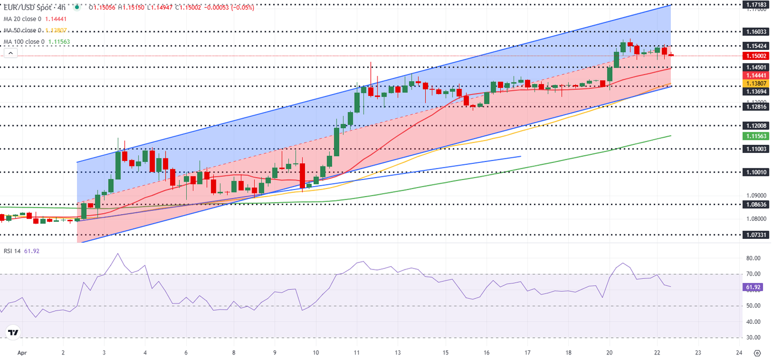 EUR/USD seems to have entered a consolidation phase near 1.1500 after gaining more than 1% and touching its highest level since 2021 above 1.1570. The pair's technical outlook suggests that the bullish bias remains intact in the near term, while signalling a loss of momentum.