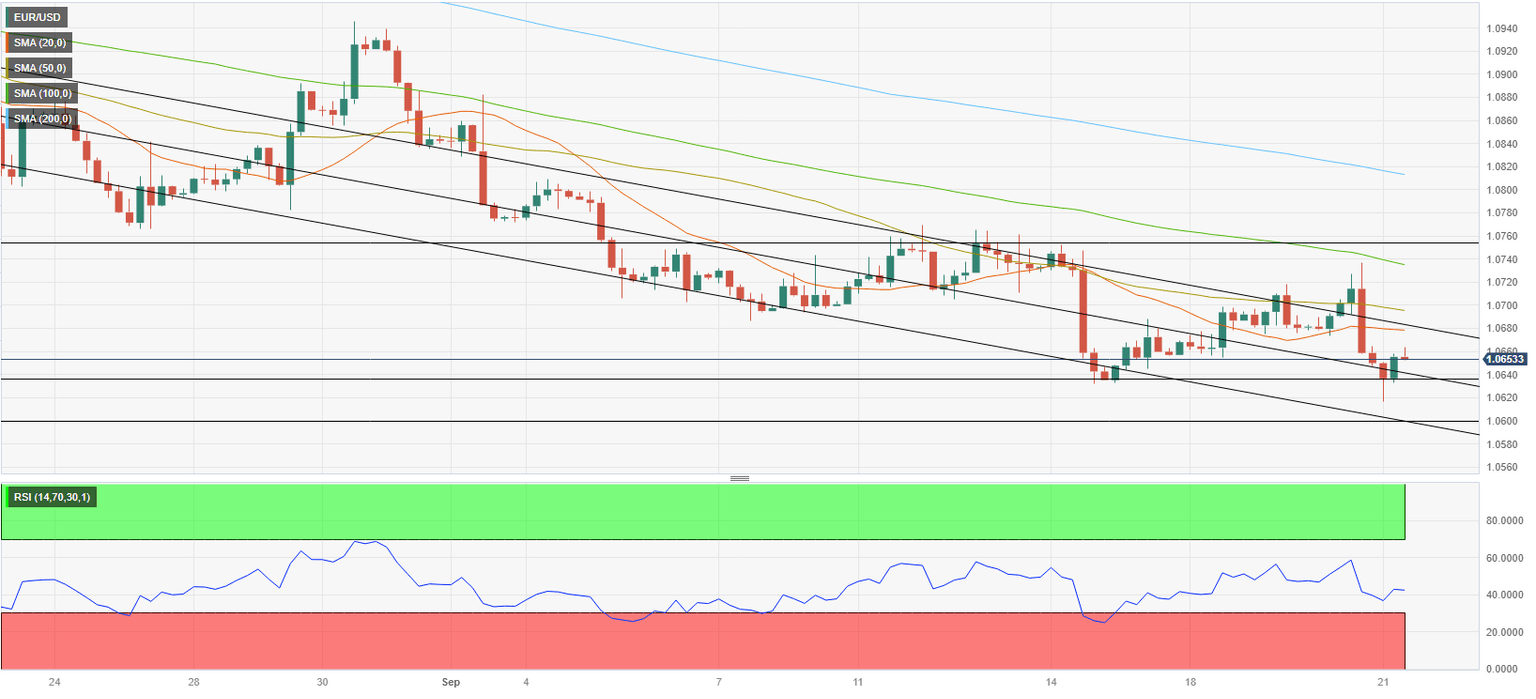 On the upside, 1.0670 (20-period Simple Moving Average (SMA), upper-limit of the descending channel) aligns as immediate resistance before 1.0700 (psychological level, static level, 50-period SMA). A four-hour close above the latter could attract buyers and open the door for an extended recovery toward 1.0740 (100-period SMA).